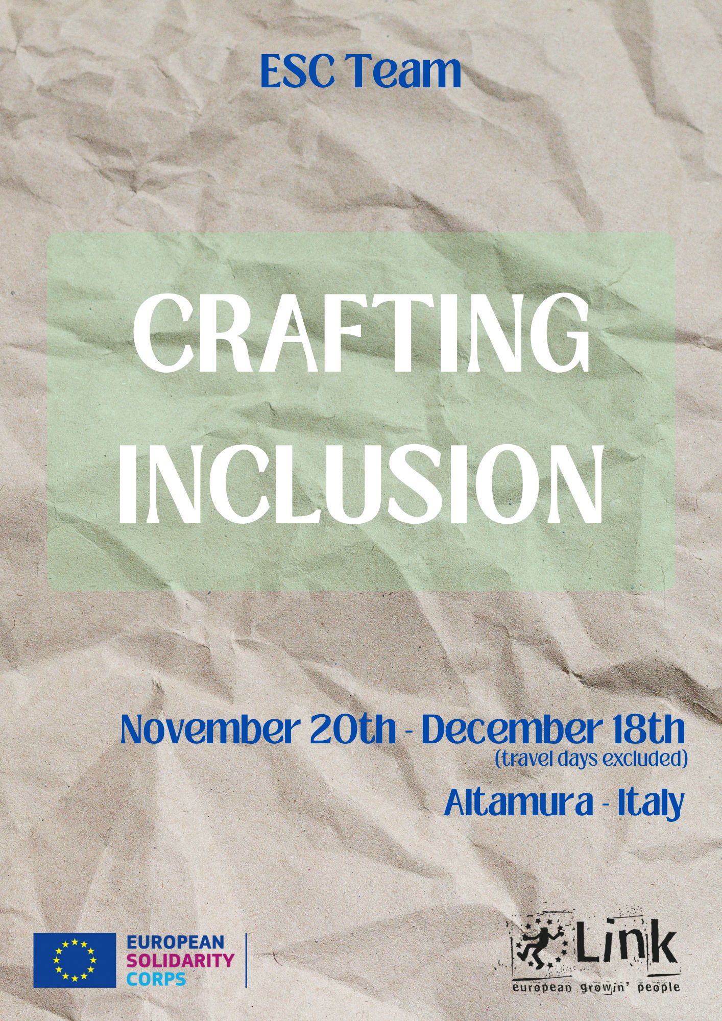 Il progetto prevede la presenza ad Altamura di un gruppo di 11 giovani partecipanti al Corpo Europeo di Solidarietà, di cui 4 italiani e 7 provenienti da vari paesi europei (Austria, Finlandia, Irlanda, Olanda, Portogallo, Serbia, Spagna). Crafting Inlcusion è un progetto focalizzato sul tema dell'incusione sociale e ha l'obiettivo di realizzare attività manuali e di socializzazione con gruppi di persone fragili (anziani, disabili). Il tema dell'inclusione tocca anche la selezione dei volontari, con un gruppo che include giovani con minori opportunità. Il progetto sarà un'occasione per vivere insieme un periodo di avvicinamento al Natale più solidale e interculturale.